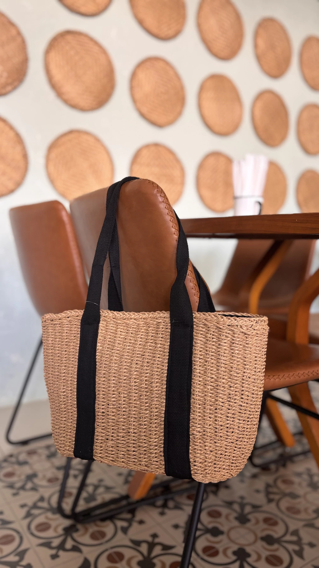 - Material Resistente: Feita em poliéster imitando palha, une a aparência natural com a resistência que você precisa para o uso cotidiano.
